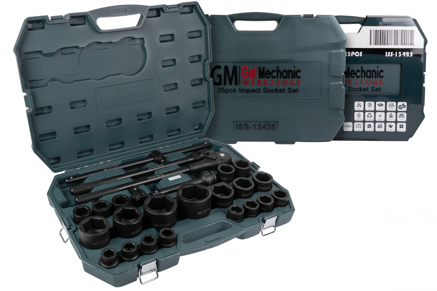 Професійний набір GUT MECHANIC ISS13425 включає 25 елементів із посадковим квадратом 3/4", у тому числі ударні торцеві головки, тріскачку та воротки. Комплект призначений для роботи з великогабаритним і високоміцним кріпленням у вантажному транспорті, спецтехніці та промисловому обладнанні.